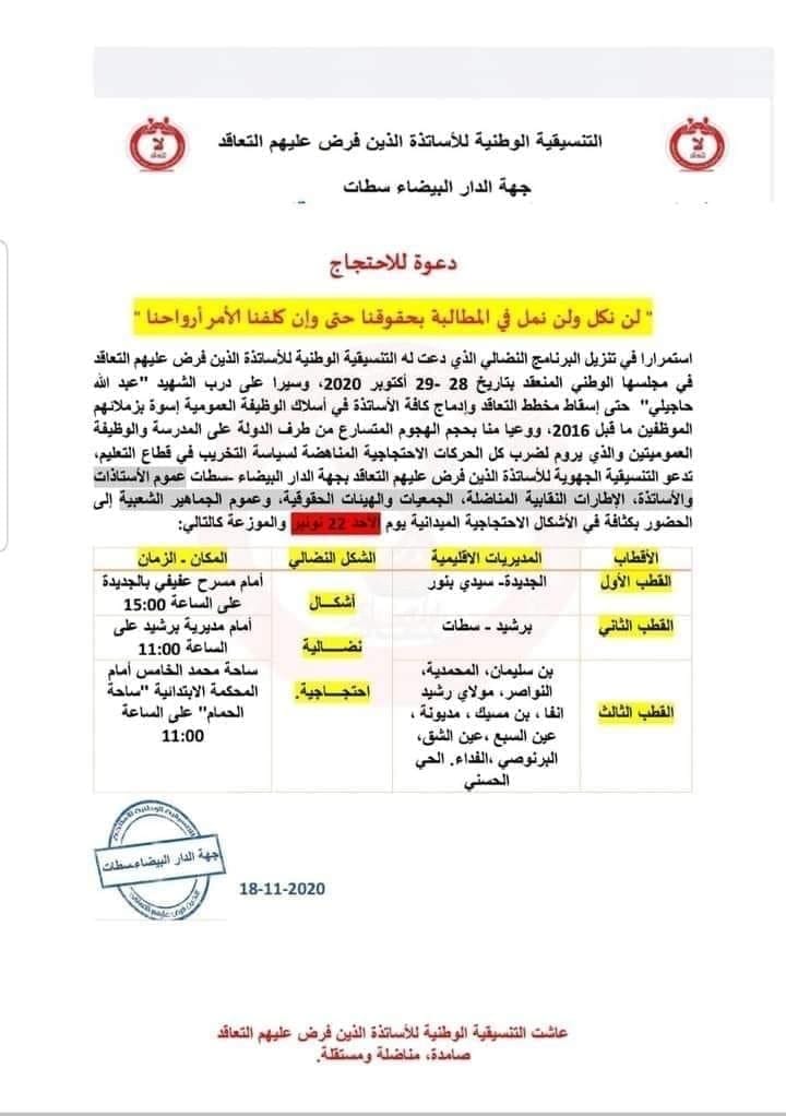ودعت التنسيقية إلى هذه الوقفة وبرمجة أخرى بسيدي بنور، وسطات، والمحمدية، في إطار تنزيل برنامج نضالي، للمطالبة بإلغاء نظام التعاقد وإدماجهم في سلك الوظيفة العمومية.