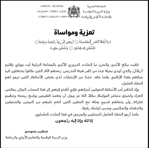Suite au tragique accident de la route, qui a coûté la vie, dimanche, à des membres du corps enseignant, qui étaient en poste dans la province d’Azilal, le ministre de l’Éducation Nationale, de l’Enseignement primaire et des Sports, Chakib Benmoussa, a tenu à présenter ses condoléances aux familles des victimes, et plus généralement à celle de l’enseignement.