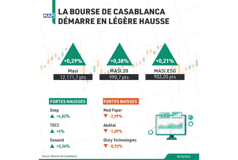 La Bourse de Casablanca démarrait en légère hausse mercredi, son principal indice, le MASI, progressant de 0,29% à 12.171,7 points (pts).
