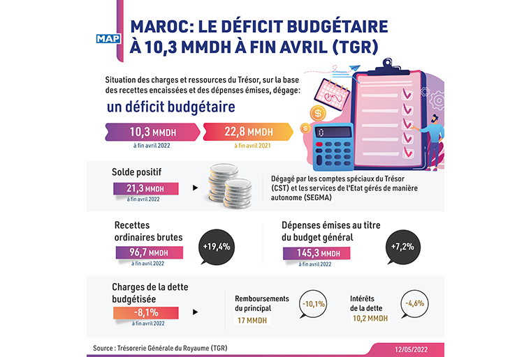 La situation des charges et ressources du Trésor, sur la base des recettes encaissées et des dépenses émises, dégage un déficit budgétaire de 10,3 milliards de dirhams (MMDH) à fin avril 2022, contre un déficit de 22,8 MMDH durant la même période un an auparavant, indique la Trésorerie Générale du Royaume (TGR).